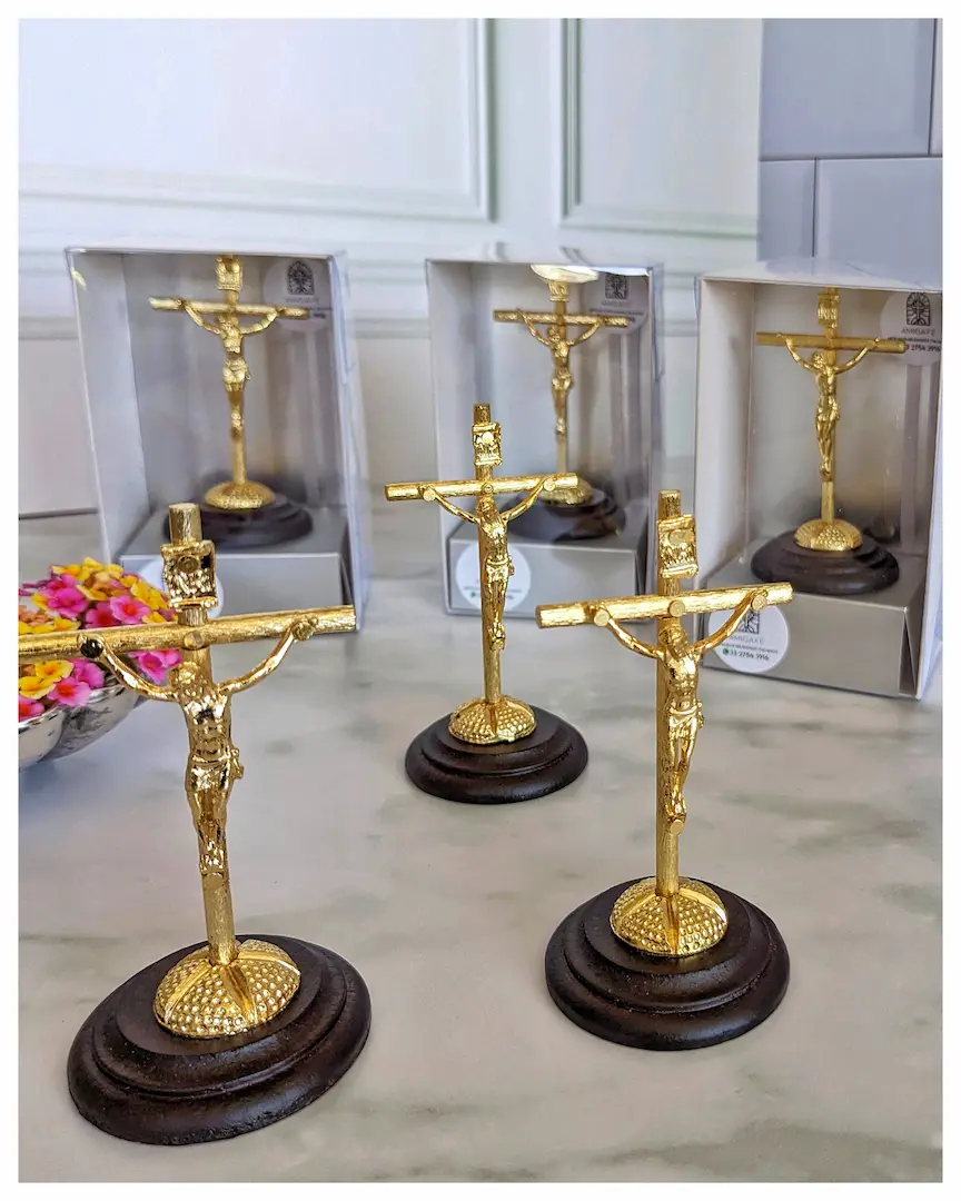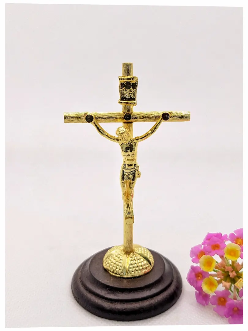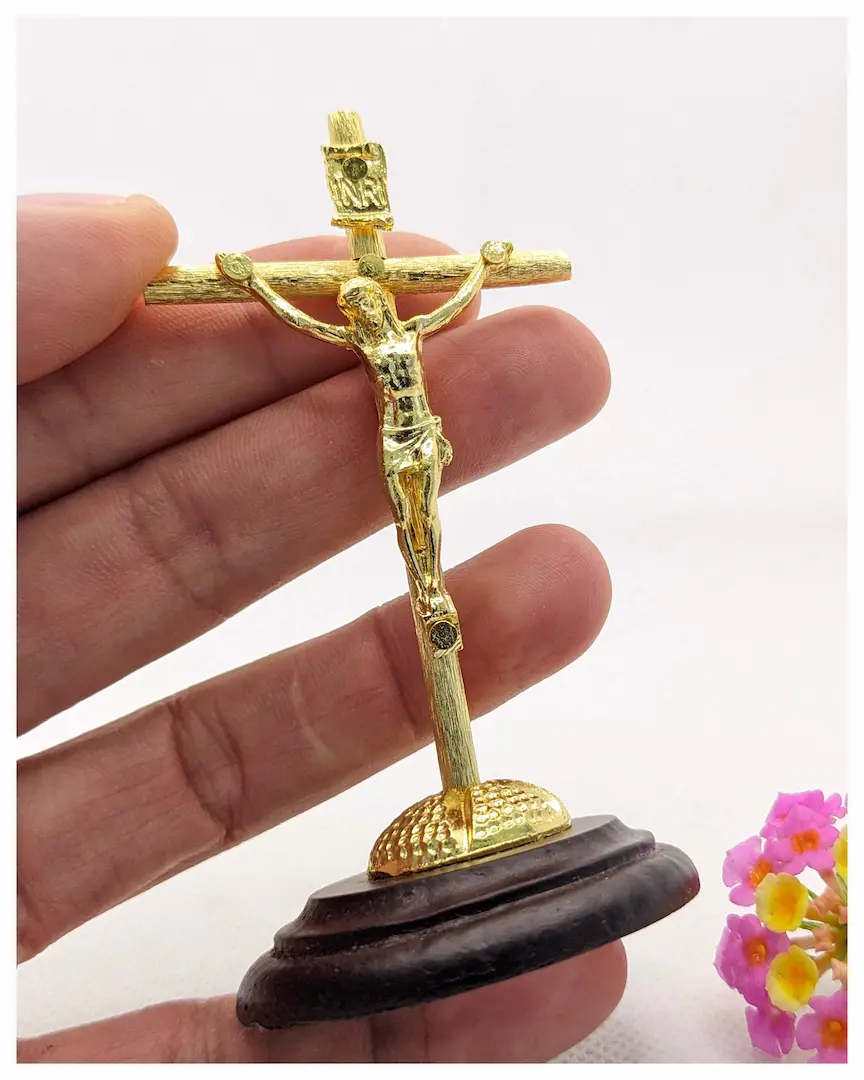 Material: Cruz tubular metálica dorada, cristo metálico en baño de ORO, base circular en madera de pino.