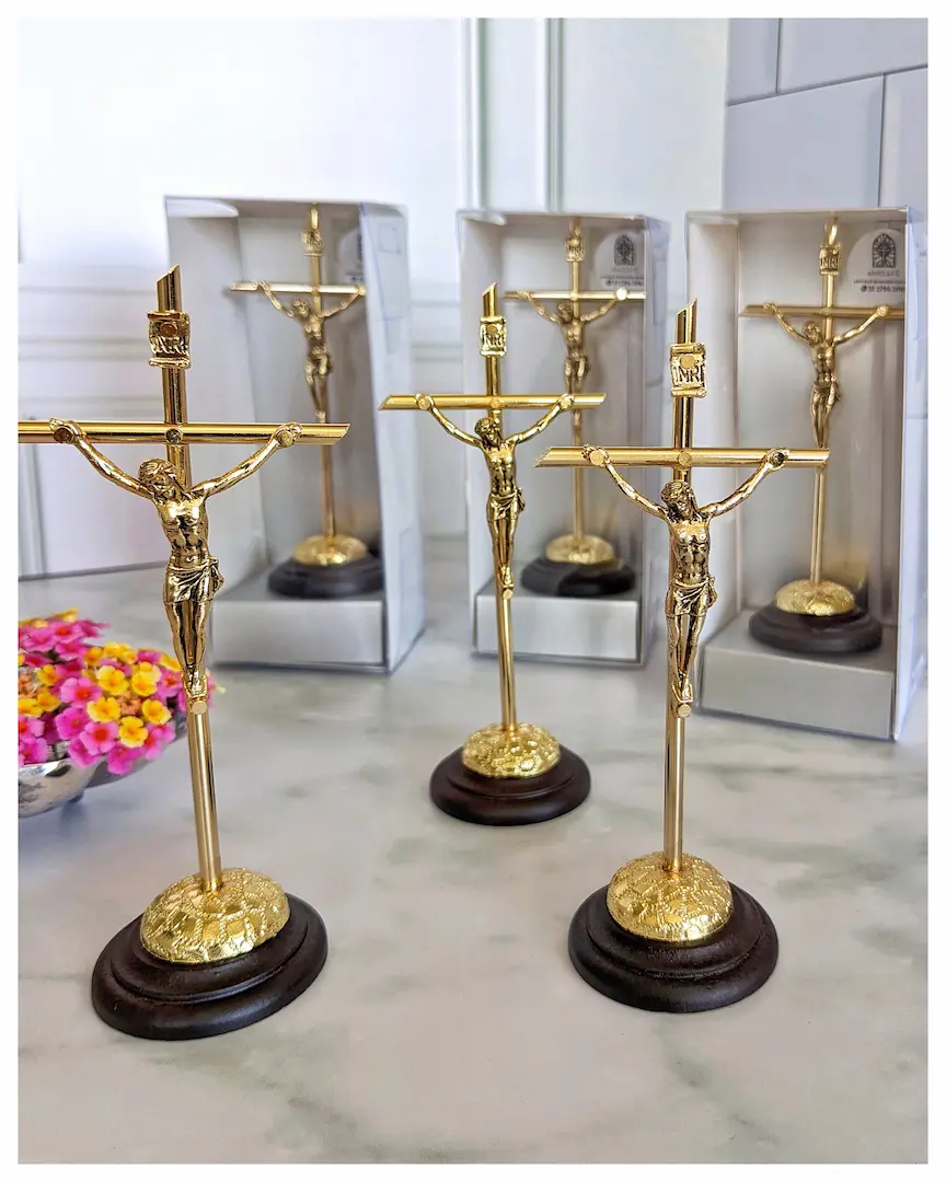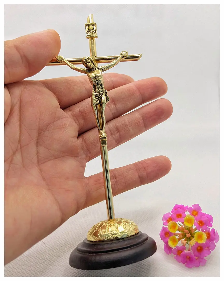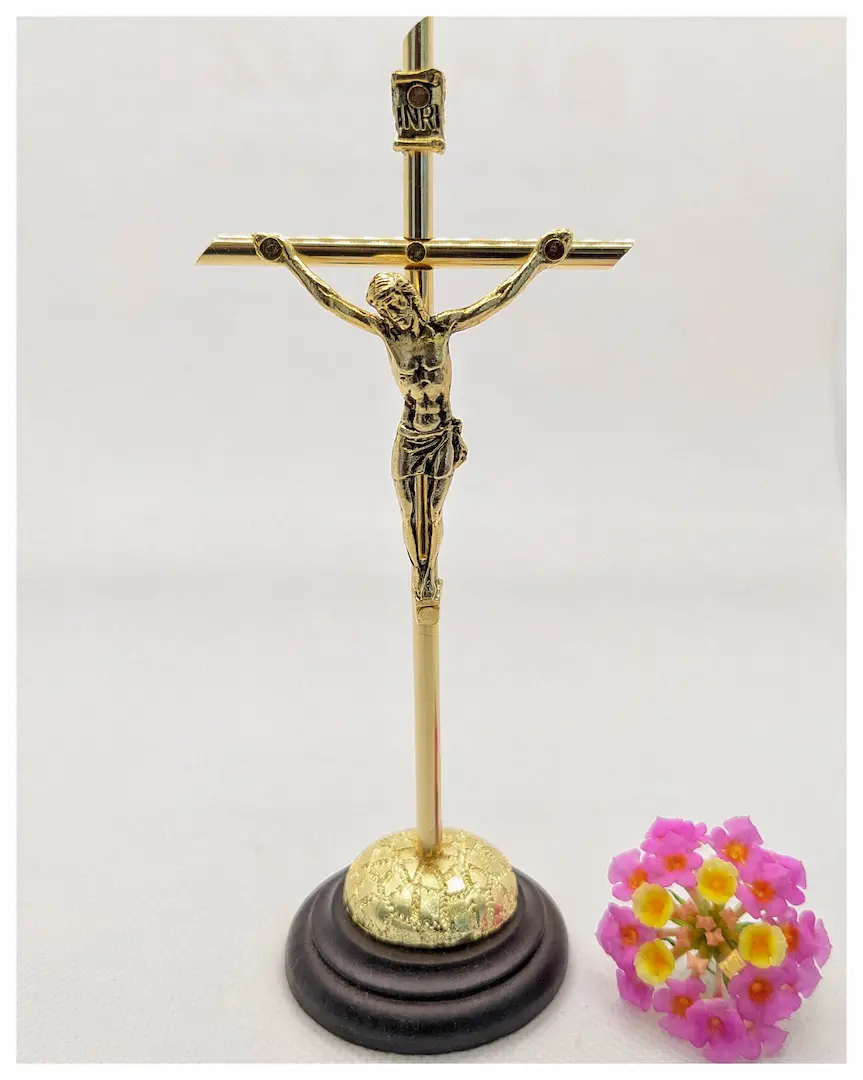 Material: Cruz tubular metálica dorada, cristo metálico en baño de ORO, base circular en madera de pino.