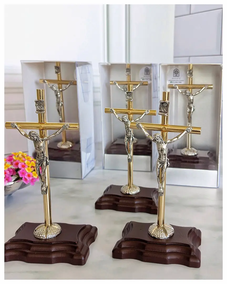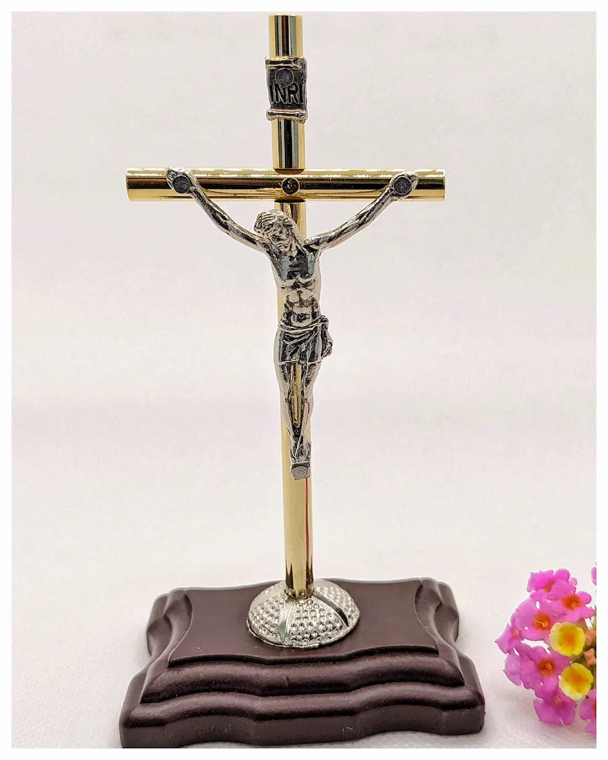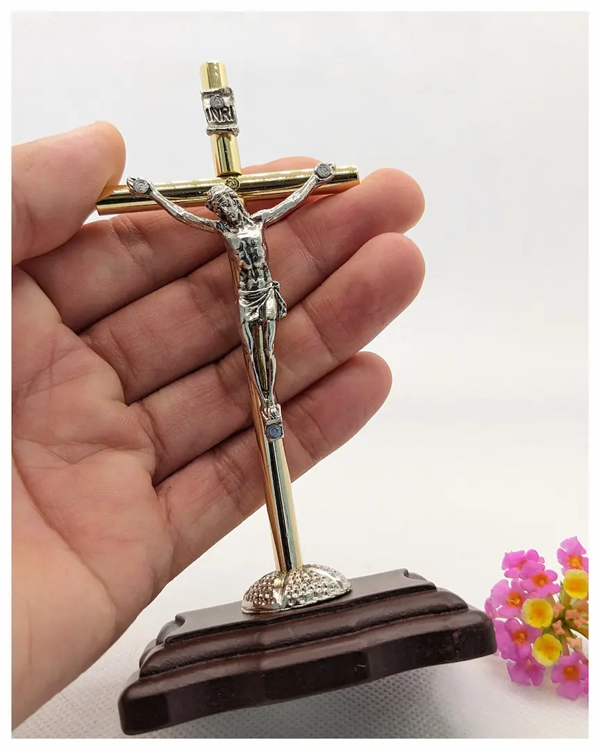Material: Cruz tubular metálica dorada, cristo metálico en baño de PLATA, base rectangular en madera de pino.